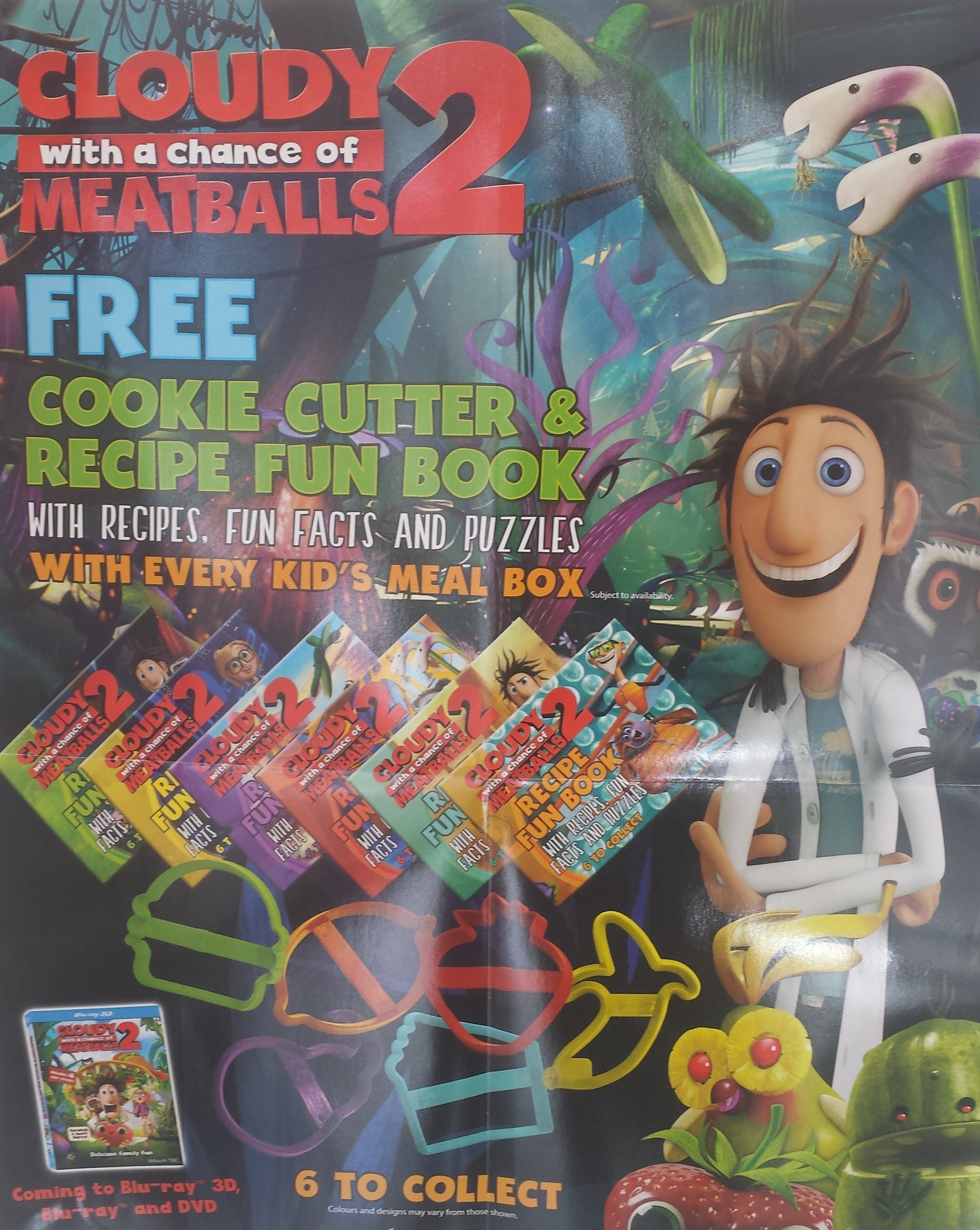 The current promotion is for the “Cloudy with a chance of Meatballs 2” DVD Release, and includes a cookie cutter, so you can make interesting shaped cookies or play-doh.